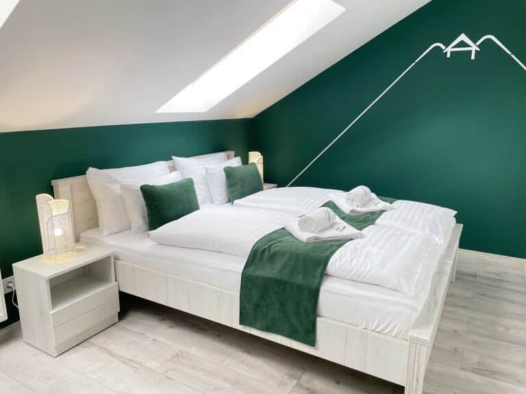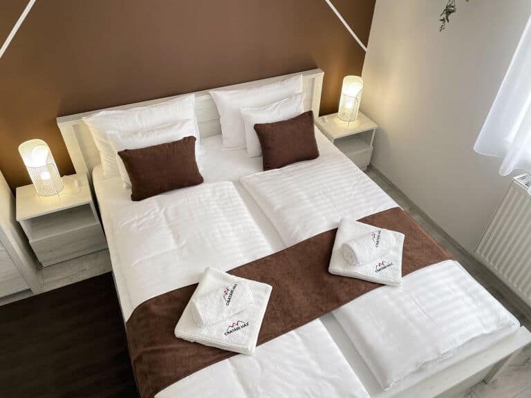 Apartmanházunk összesen 11+8 fő részére tud szállást biztosítani egy, illetve két hálószobás apartmanokban történő elhelyezéssel. Apartmanjaink saját fürdőszobákkal és modern, jól felszerelt konyhákkal rendelkeznek. Modern felszerelés, nagyméretű ágyak, nagyképernyős LED TV-k biztosítják vendégeink kényelmes tartózkodását.